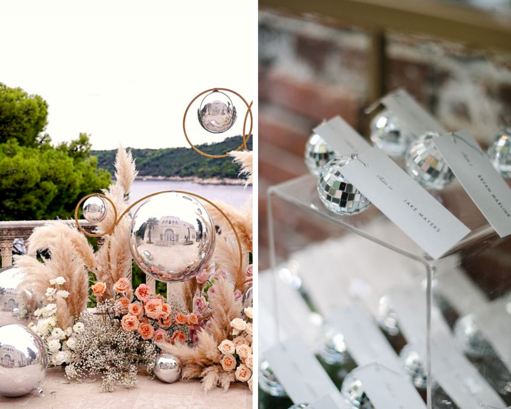 Vous la pensiez démodée et réservée aux ambiances disco ? Pas du tout ! La boule à facettes fait un retour remarqué en décoration et trouve donc parfaitement sa place pour une réception de mariage. Discrète ou centrale, quelle que soit sa place, elle joue avec la lumière et crée des effets canons sur les murs, les tables et même les invités. C’est l’objet tendance du moment !