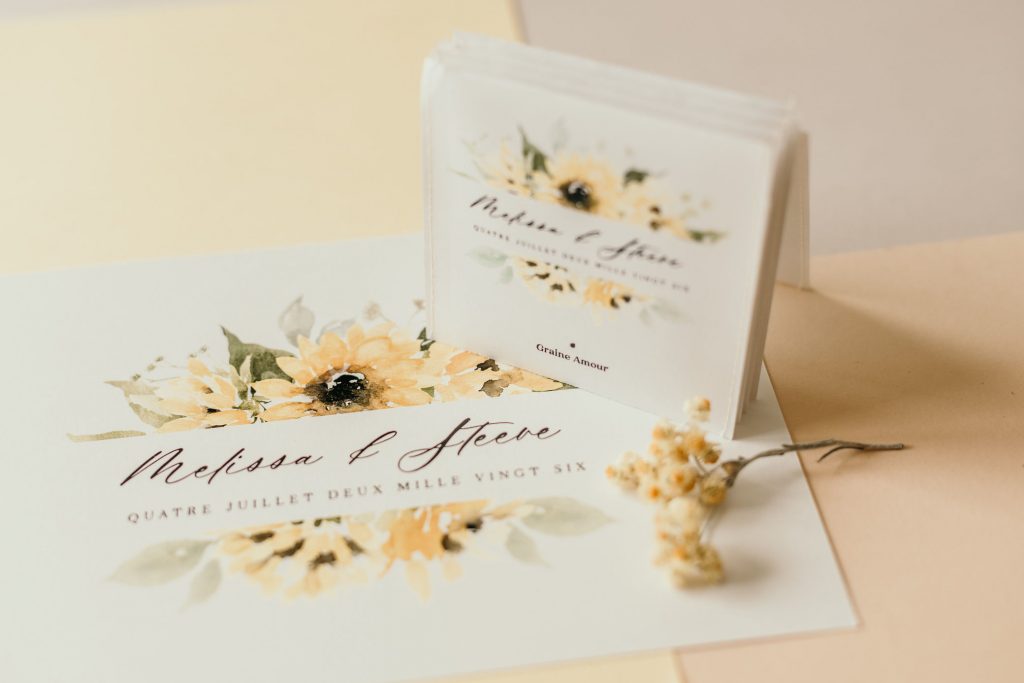 Loin de nous l’idée d’être un peu « cœur chamallow » mais avouez que la symbolique est plutôt mignonne et poétique avec les graines à planter. Ce petit sachet contient de futures jolies plantes qui permettront à vos proches de se souvenir longtemps de cette journée magique passée à vos côtés. Autre point positif, vous avez le choix entre différentes graines : un mélange pour abeille, un mélange pour papillon, des graines de basilic, de coriandre ou de persil. Autre bonne nouvelle, le petit sachet en papier qui les contient peut être personnalisé avec vos initiales ou prénoms et la date de votre mariage.