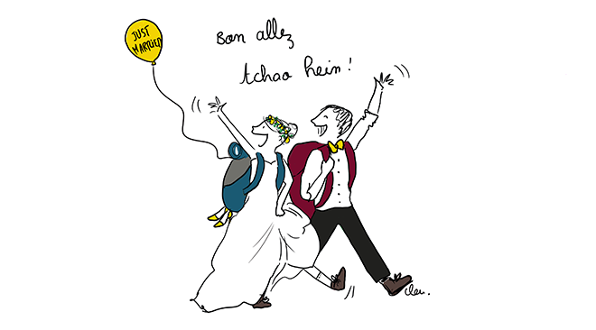2 – Vous n’avez qu’une hantise : que celui dont on ne doit pas prononcer le nom (wedding blues, chhuttt !) vienne vous titiller à peine les derniers invités congédiés. Alors, prenez la poudre d’escampette tant qu’il est encore temps et ne revenez pas avant d’être au moins trilingues et dorés comme des petits pains !