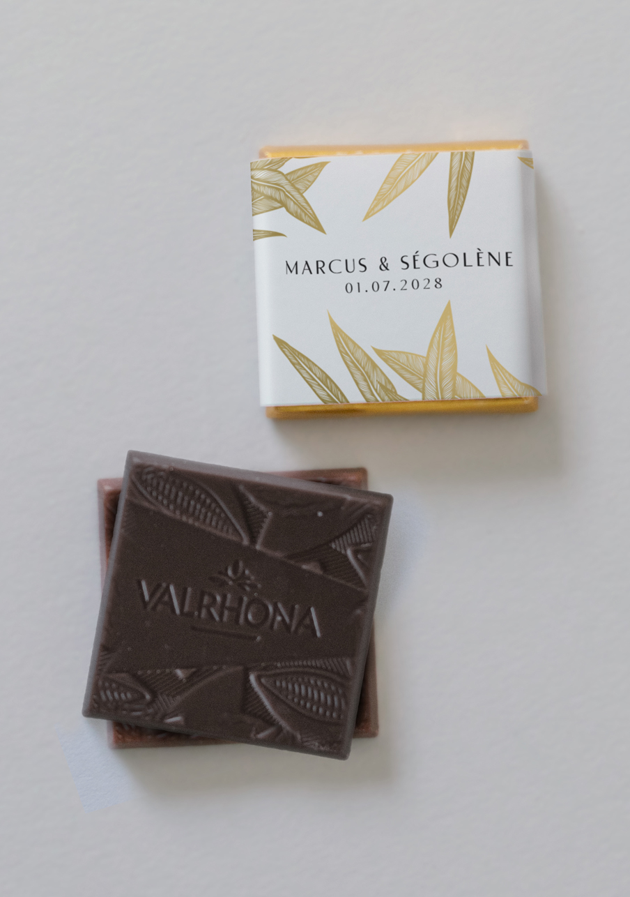 - De délicieux carrés de chocolats de la marque Valrhona, à personnaliser avec le visuel de votre choix.