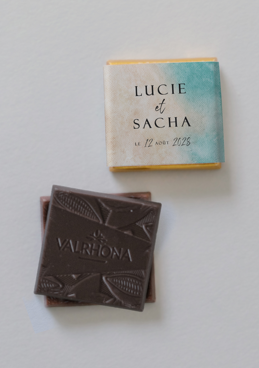 - De délicieux carrés de chocolats de la marque Valrhona, à personnaliser avec le visuel de votre choix.