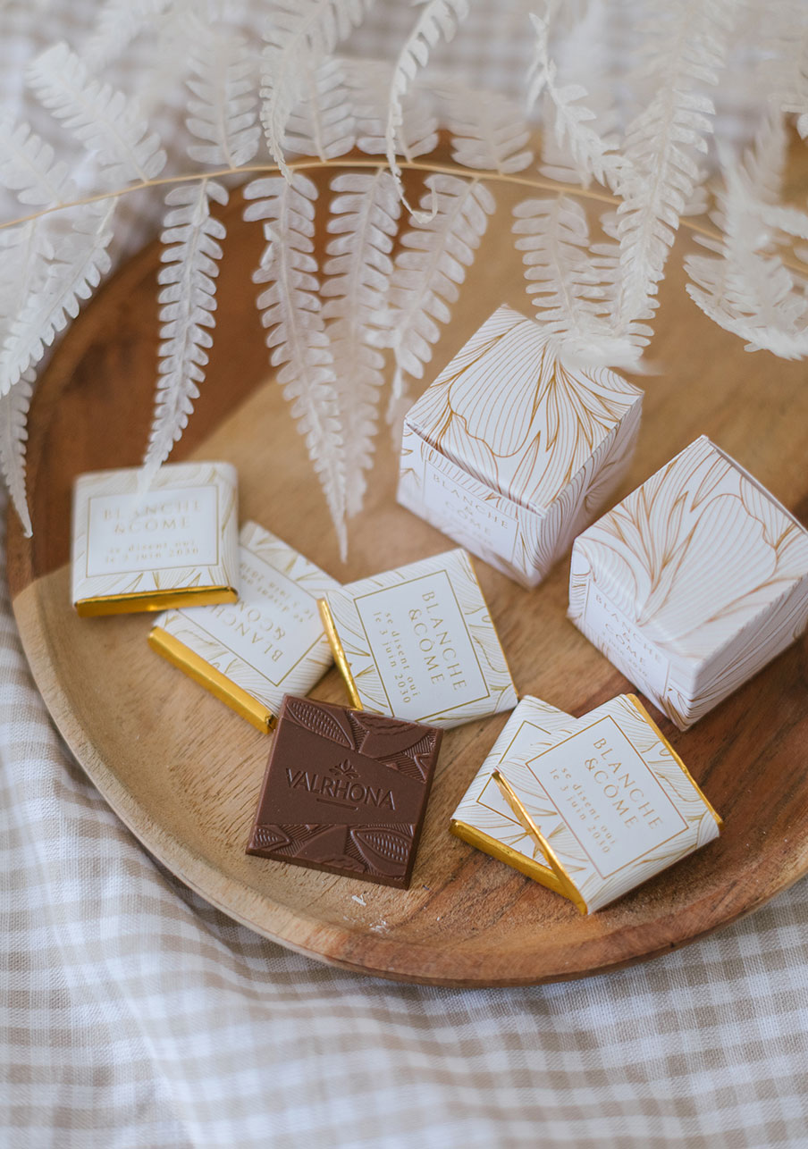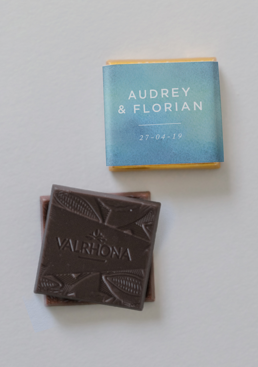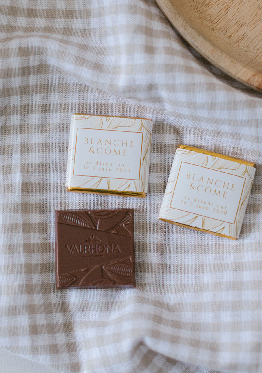 - De délicieux carrés de chocolats de la marque Valrhona, à personnaliser avec le visuel de votre choix.