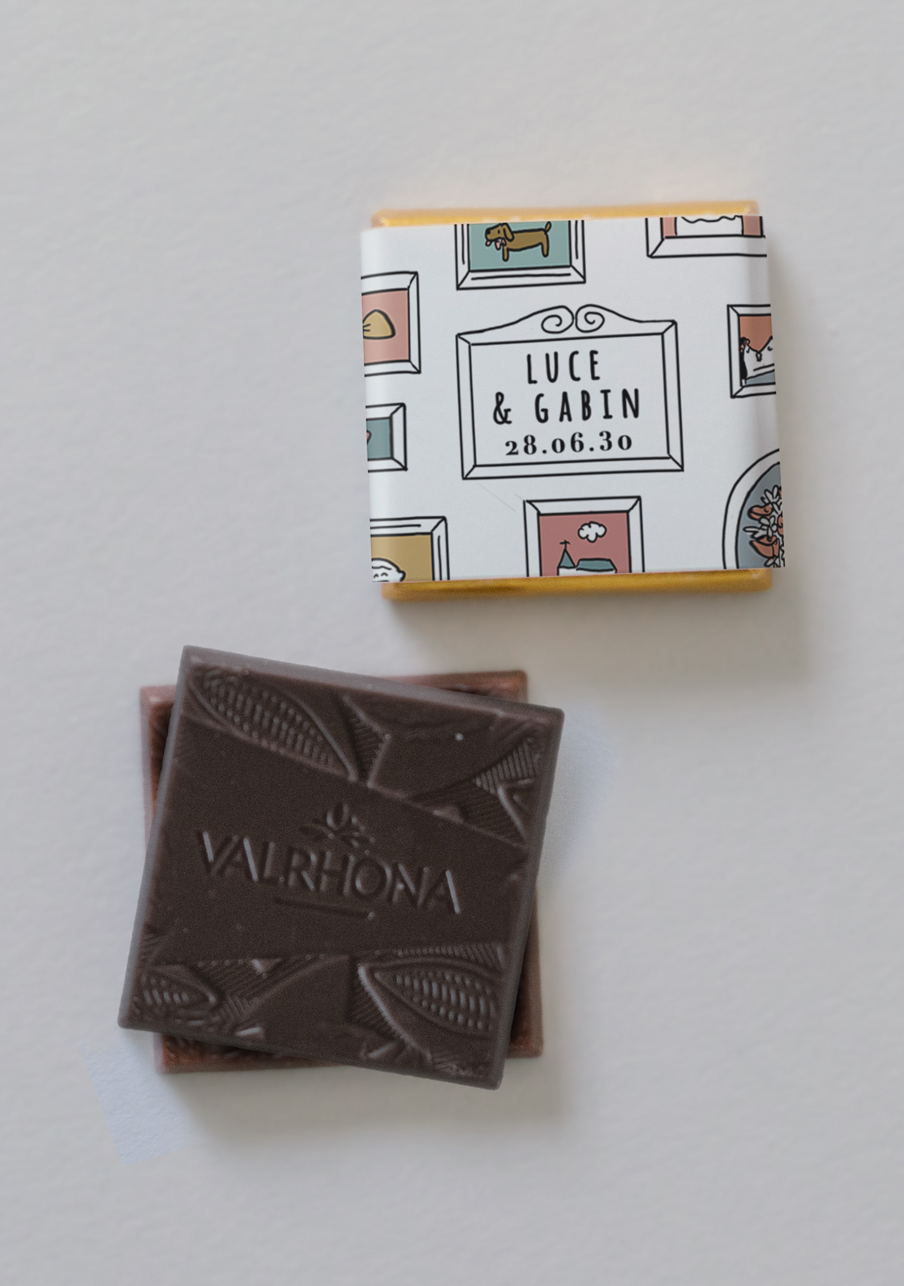 - De délicieux carrés de chocolats de la marque Valrhona, à personnaliser avec le visuel de votre choix.