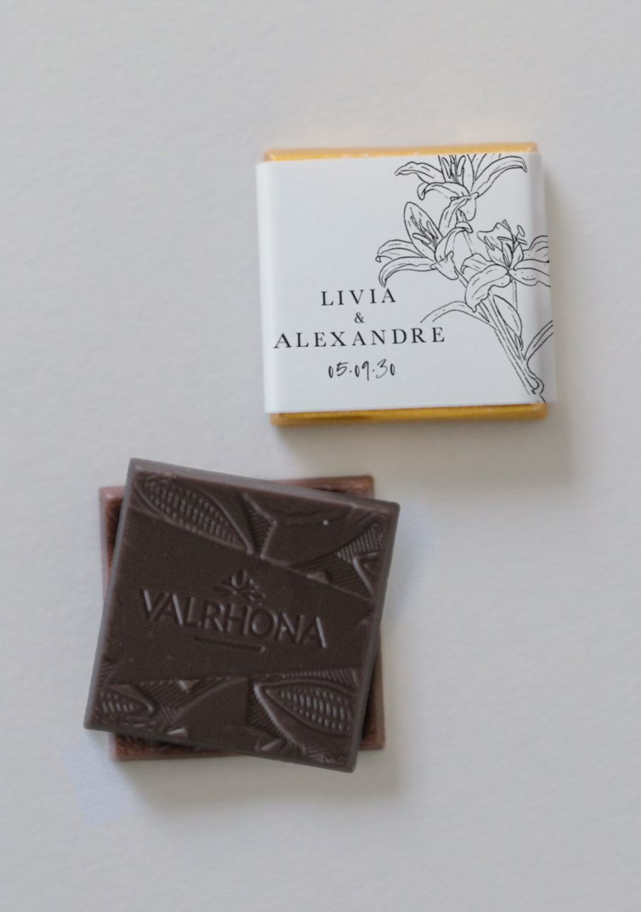 - De délicieux carrés de chocolats de la marque Valrhona, à personnaliser avec le visuel de votre choix.