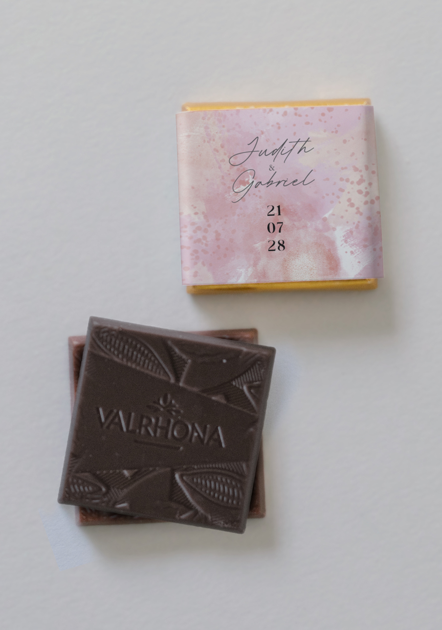 - De délicieux carrés de chocolats de la marque Valrhona, à personnaliser avec le visuel de votre choix.