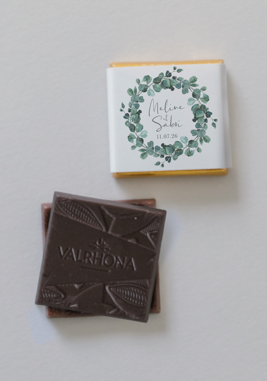 - De délicieux carrés de chocolats de la marque Valrhona, à personnaliser avec le visuel de votre choix.