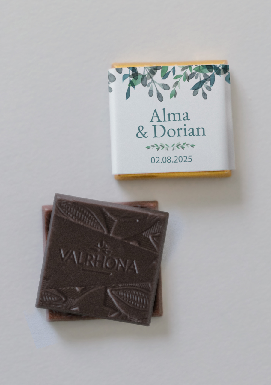- De délicieux carrés de chocolats de la marque Valrhona, à personnaliser avec le visuel de votre choix.