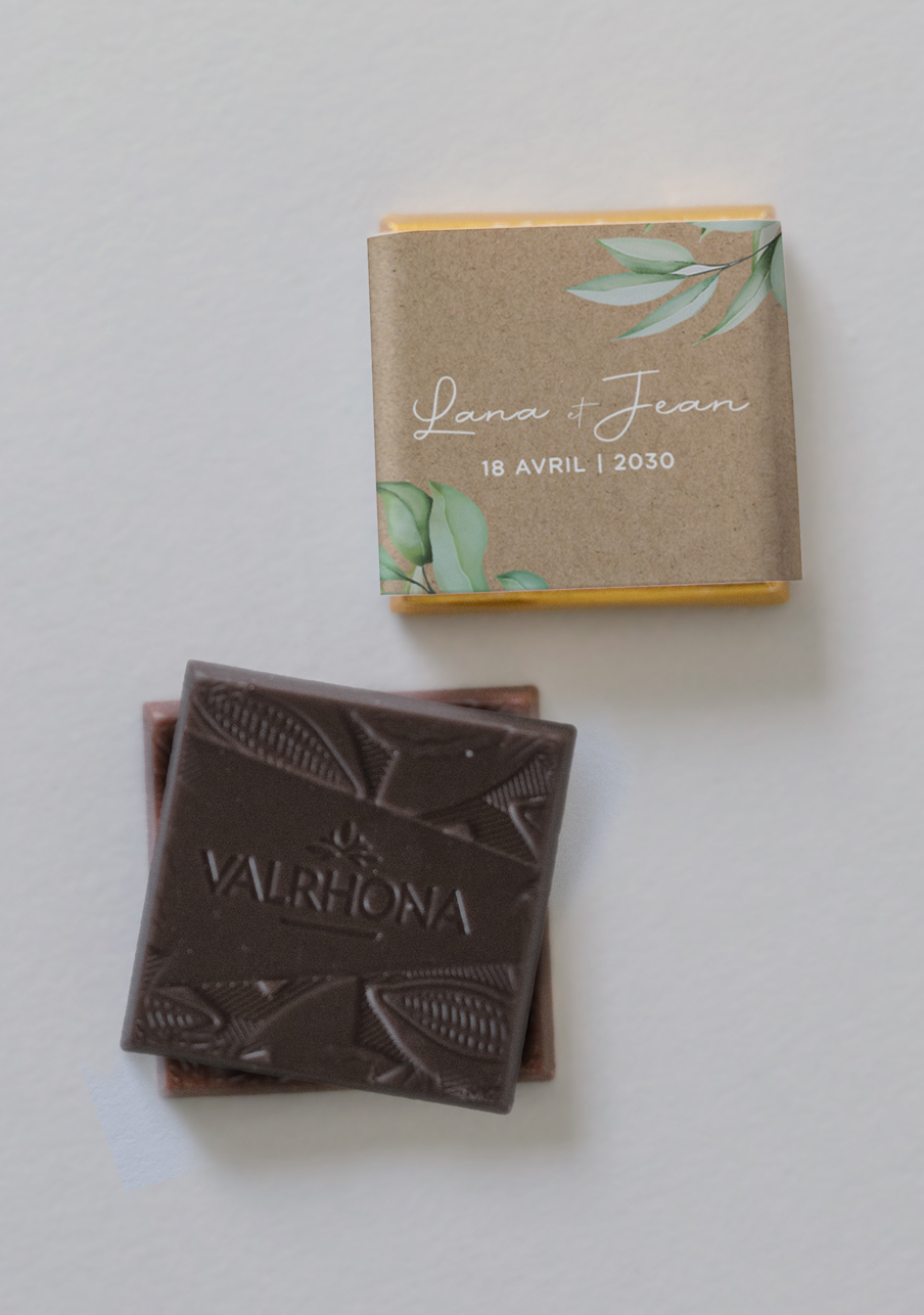 - De délicieux carrés de chocolats de la marque Valrhona, à personnaliser avec le visuel de votre choix.