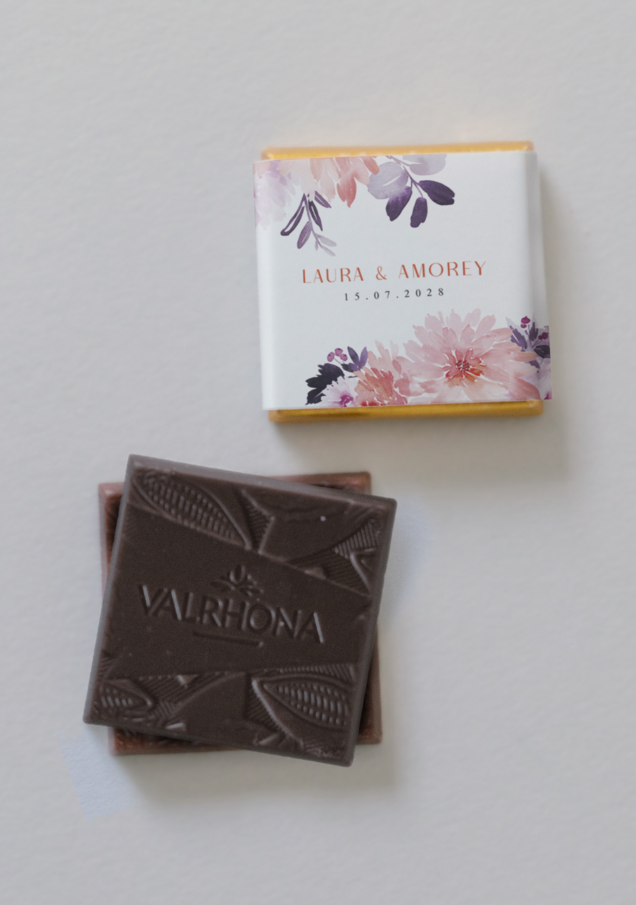 - De délicieux carrés de chocolats de la marque Valrhona, à personnaliser avec le visuel de votre choix.