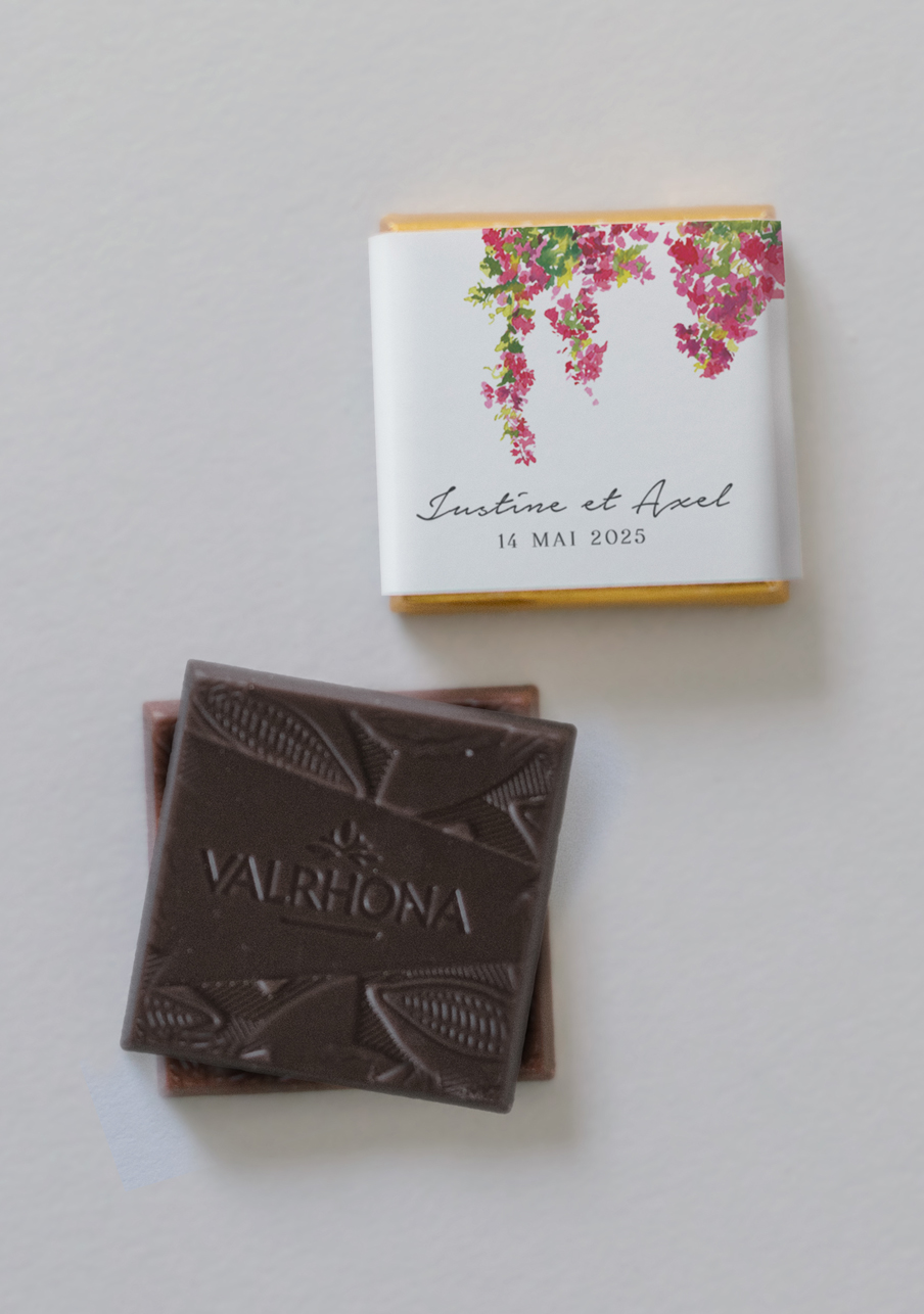 - De délicieux carrés de chocolats de la marque Valrhona, à personnaliser avec le visuel de votre choix.