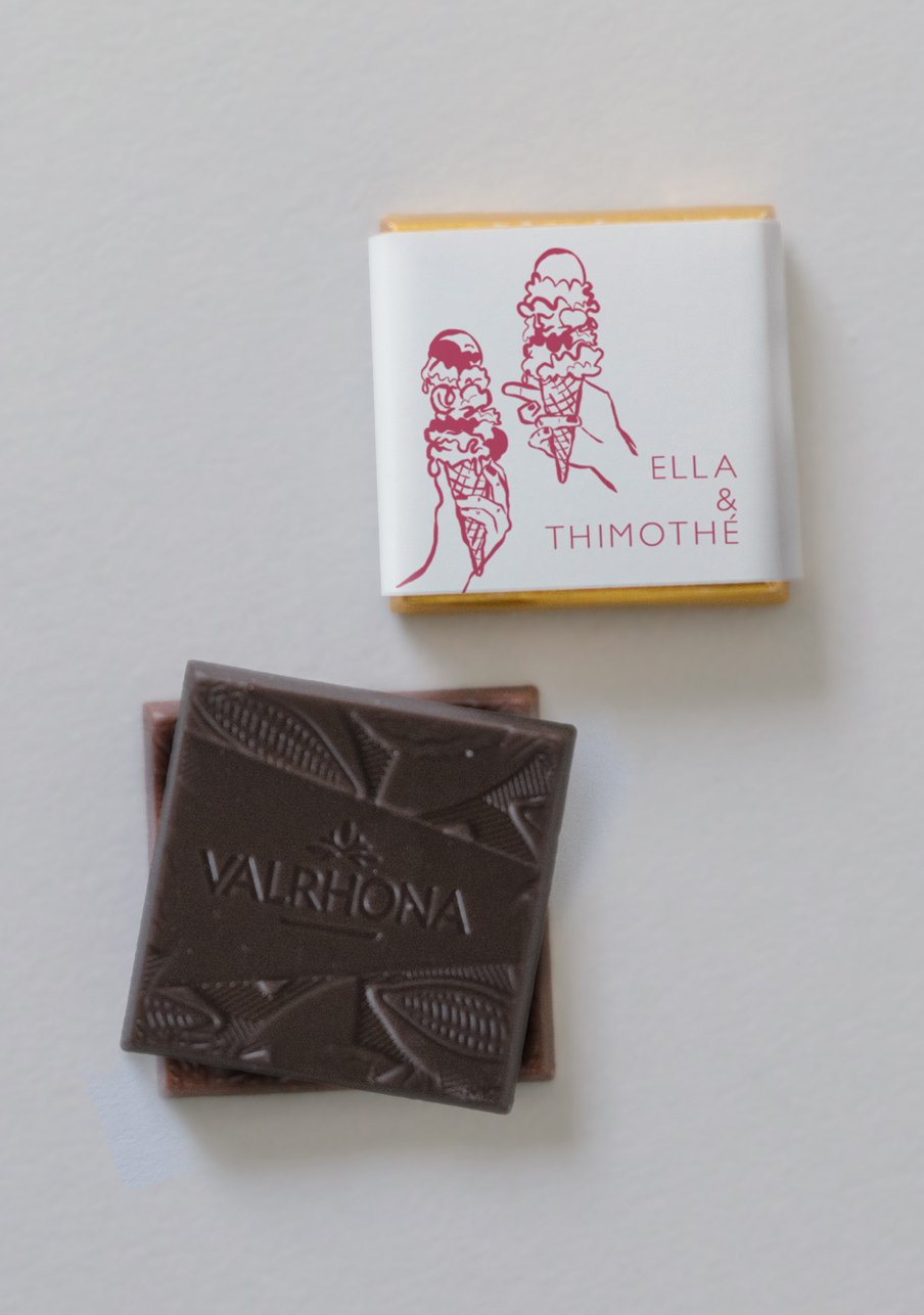 - De délicieux carrés de chocolats de la marque Valrhona, à personnaliser avec le visuel de votre choix.