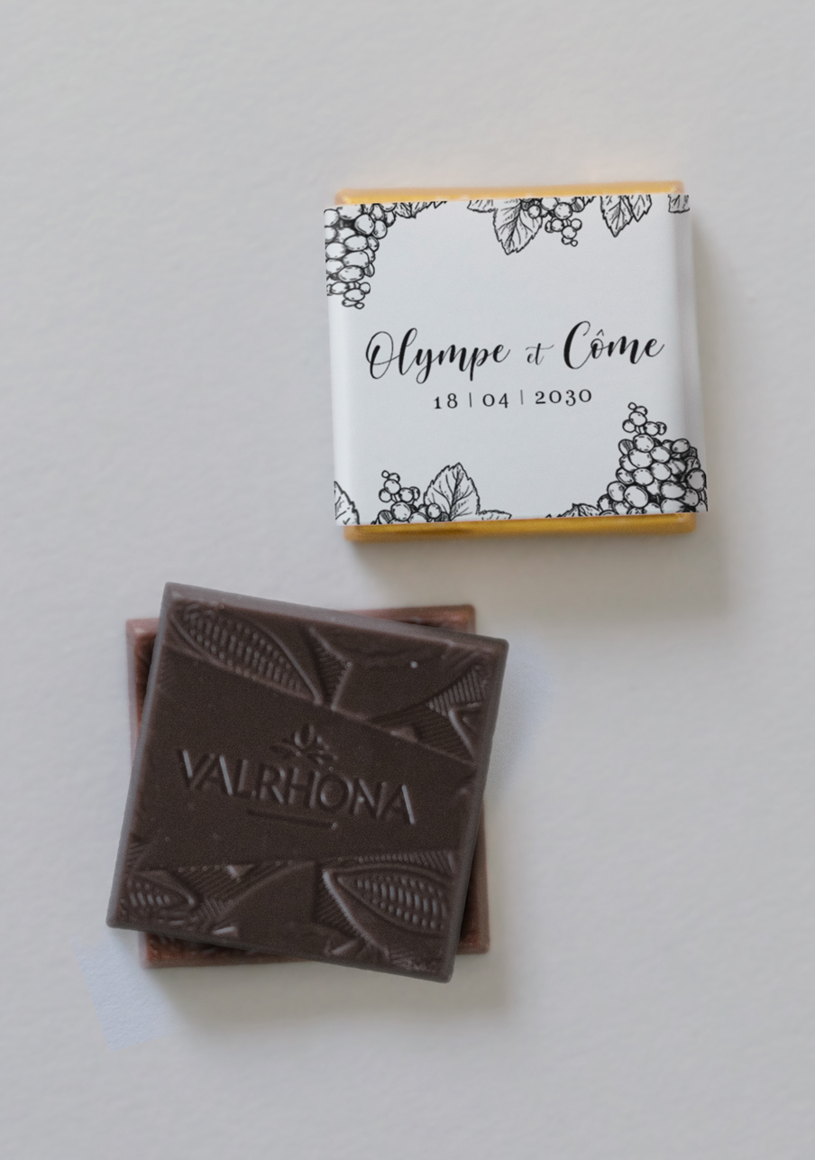 - De délicieux carrés de chocolats de la marque Valrhona, à personnaliser avec le visuel de votre choix.