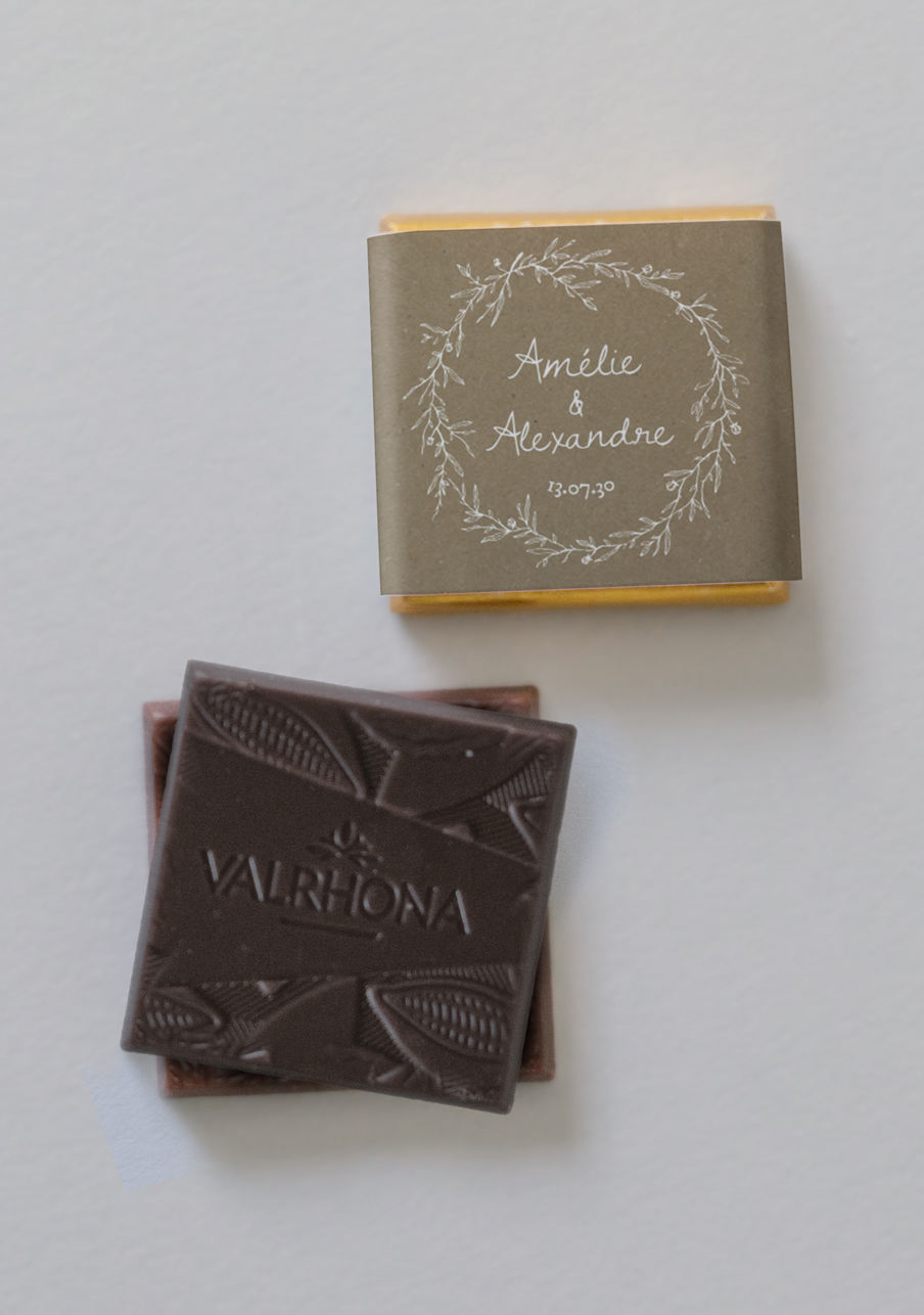 - De délicieux carrés de chocolats de la marque Valrhona, à personnaliser avec le visuel de votre choix.