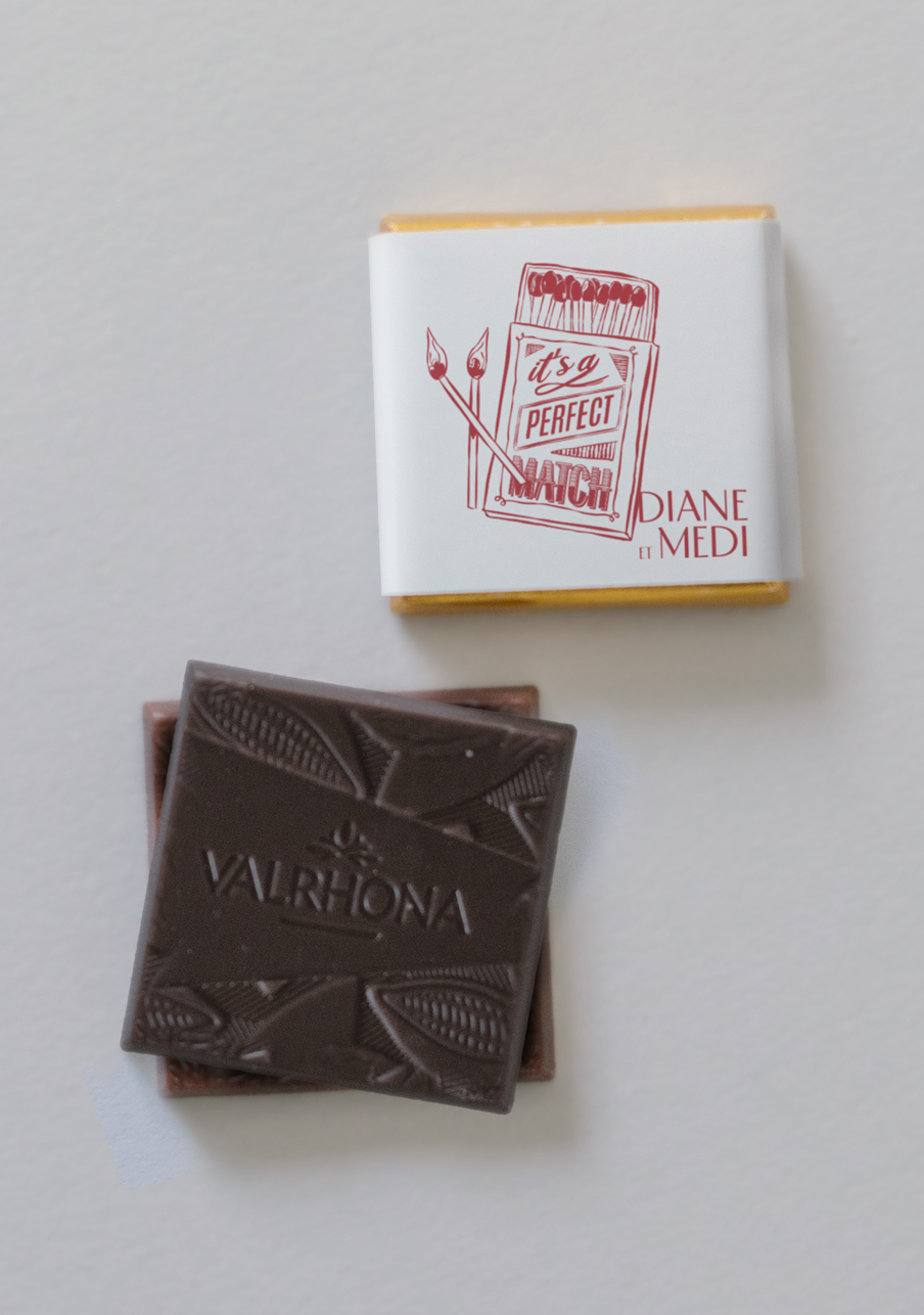 - De délicieux carrés de chocolats de la marque Valrhona, à personnaliser avec le visuel de votre choix.