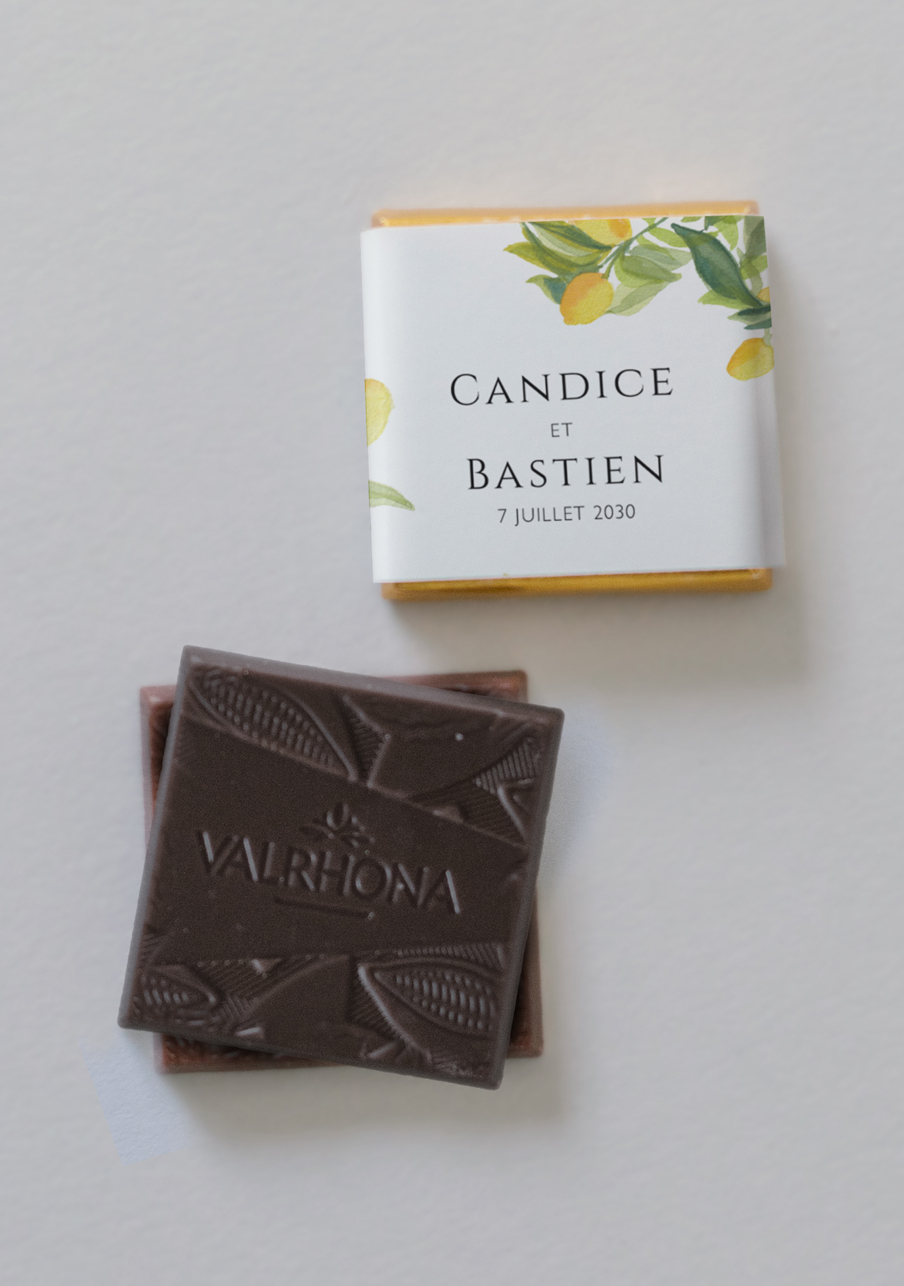 - De délicieux carrés de chocolats de la marque Valrhona, à personnaliser avec le visuel de votre choix.