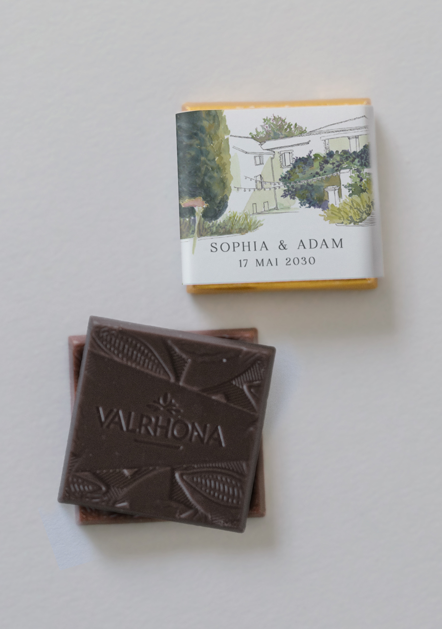 - De délicieux carrés de chocolats de la marque Valrhona, à personnaliser avec le visuel de votre choix.