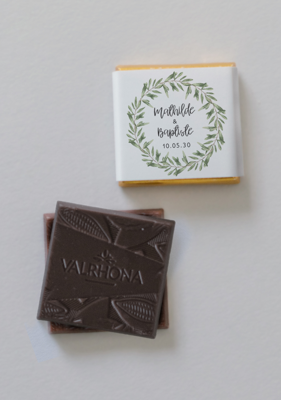 - De délicieux carrés de chocolats de la marque Valrhona, à personnaliser avec le visuel de votre choix.