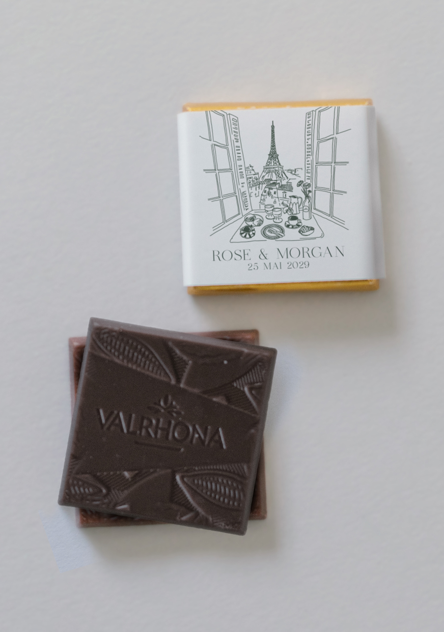 - De délicieux carrés de chocolats de la marque Valrhona, à personnaliser avec le visuel de votre choix.