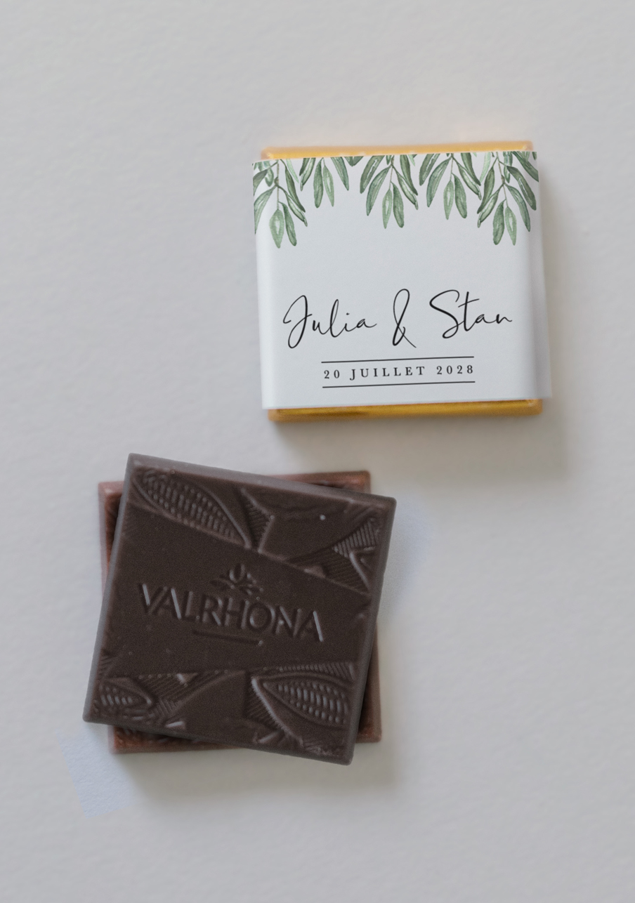 - De délicieux carrés de chocolats de la marque Valrhona, à personnaliser avec le visuel de votre choix.