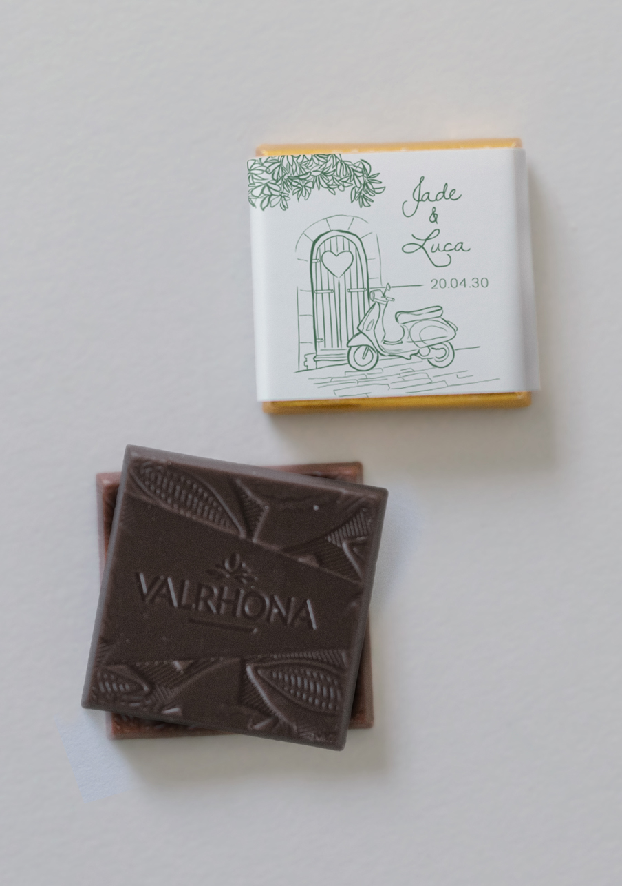- De délicieux carrés de chocolats de la marque Valrhona, à personnaliser avec le visuel de votre choix.