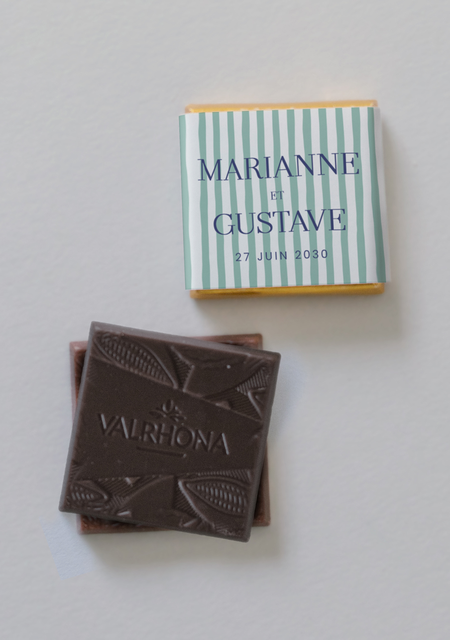 - De délicieux carrés de chocolats de la marque Valrhona, à personnaliser avec le visuel de votre choix.