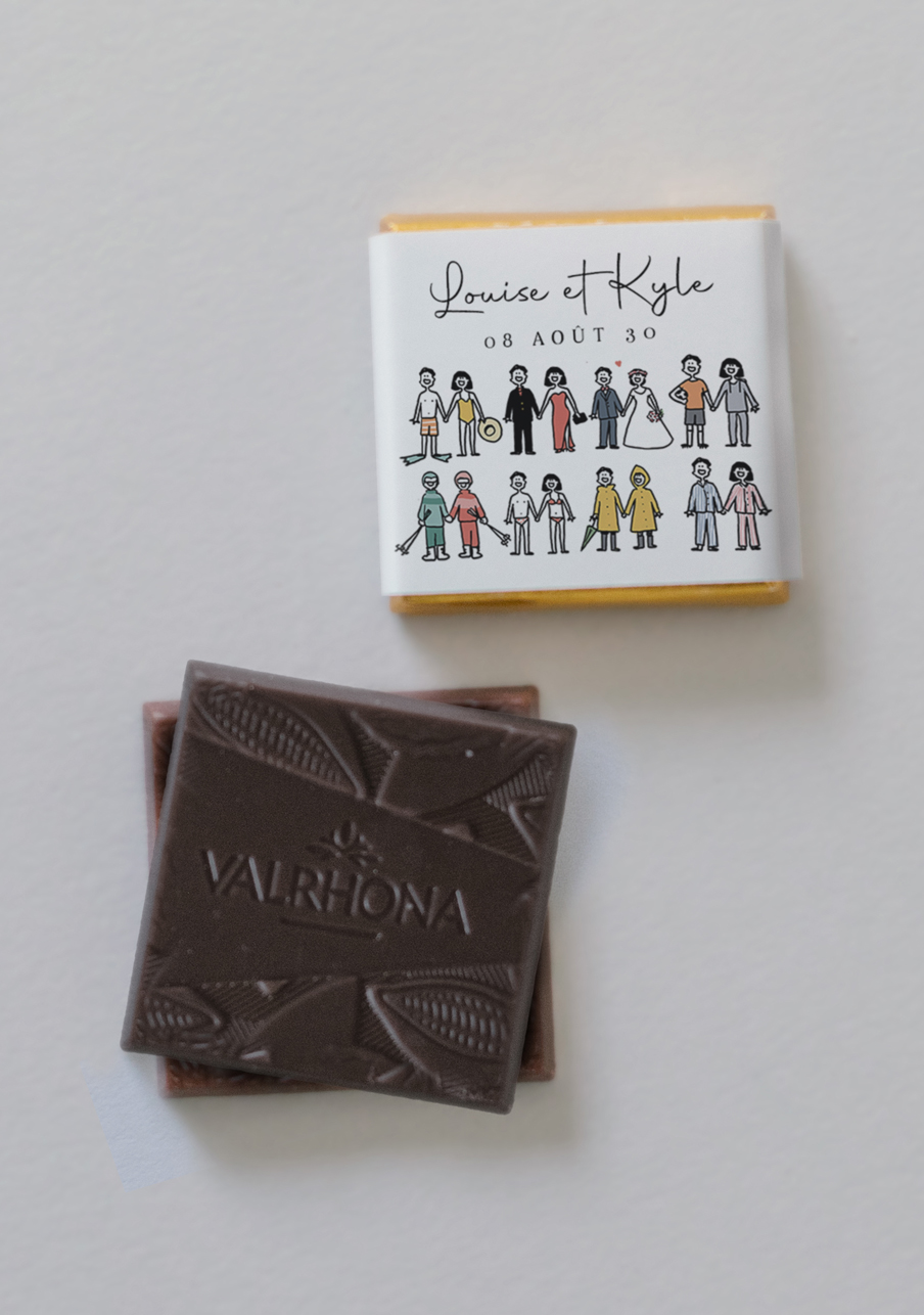 - De délicieux carrés de chocolats de la marque Valrhona, à personnaliser avec le visuel de votre choix.