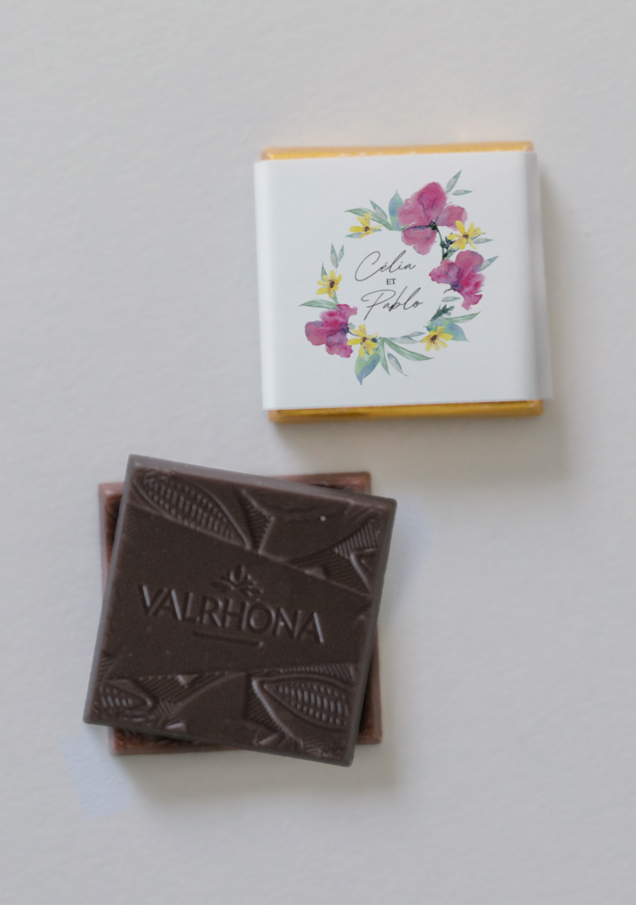 - De délicieux carrés de chocolats de la marque Valrhona, à personnaliser avec le visuel de votre choix.