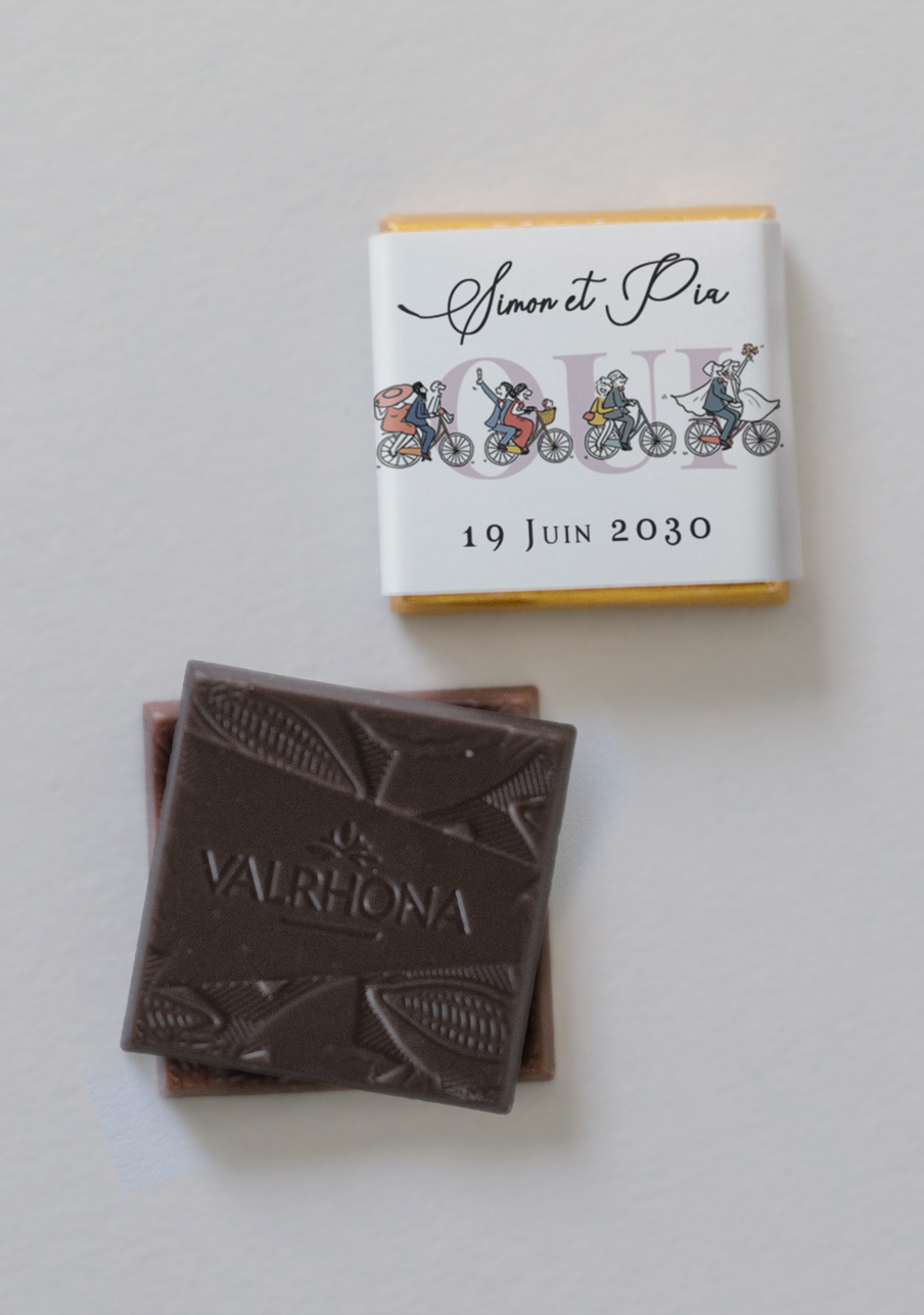 - De délicieux carrés de chocolats de la marque Valrhona, à personnaliser avec le visuel de votre choix.