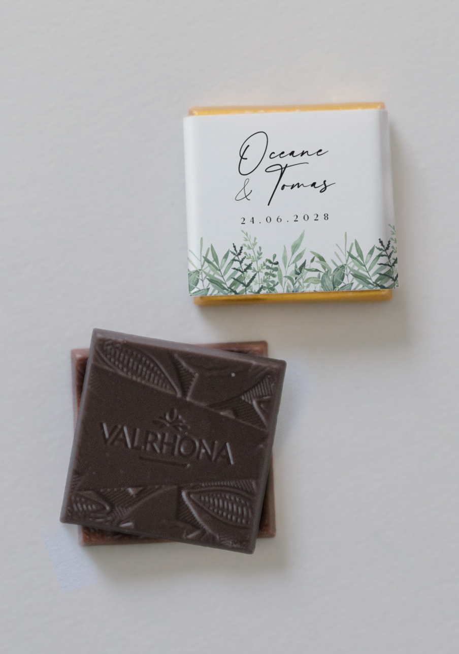 - De délicieux carrés de chocolats de la marque Valrhona, à personnaliser avec le visuel de votre choix.