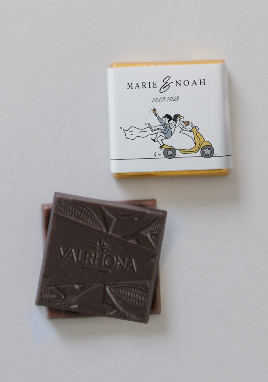 - De délicieux carrés de chocolats de la marque Valrhona, à personnaliser avec le visuel de votre choix.