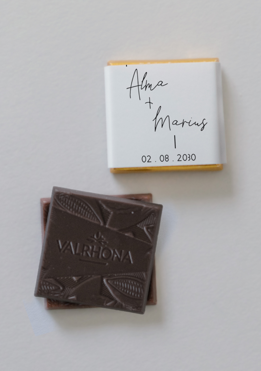 - De délicieux carrés de chocolats de la marque Valrhona, à personnaliser avec le visuel de votre choix.
