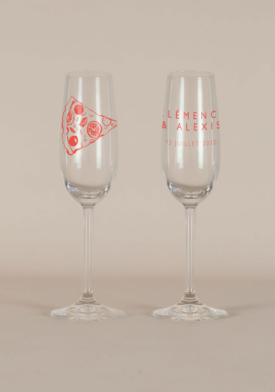 Ces flûtes ont une jolie forme et la gravure rend bien. Je les ai montrées au traiteur qui a paru surpris. ce n'est pas un modèle qu'il doit voir couramment. Je lui ai donné les coordonnées du site. Vraiment parfait pour donner à mes invités.