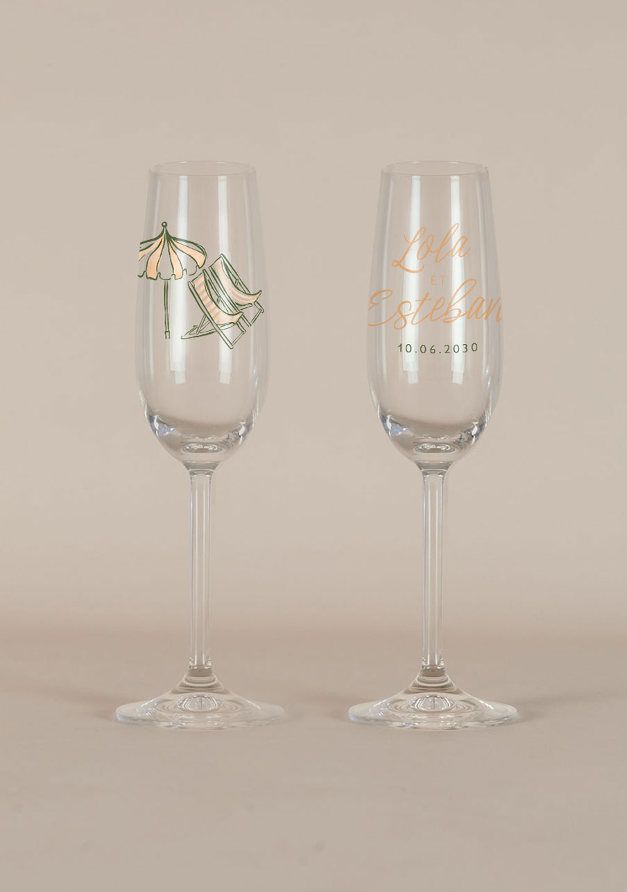 Ces flûtes ont une jolie forme et la gravure rend bien. Je les ai montrées au traiteur qui a paru surpris. ce n'est pas un modèle qu'il doit voir couramment. Je lui ai donné les coordonnées du site. Vraiment parfait pour donner à mes invités.