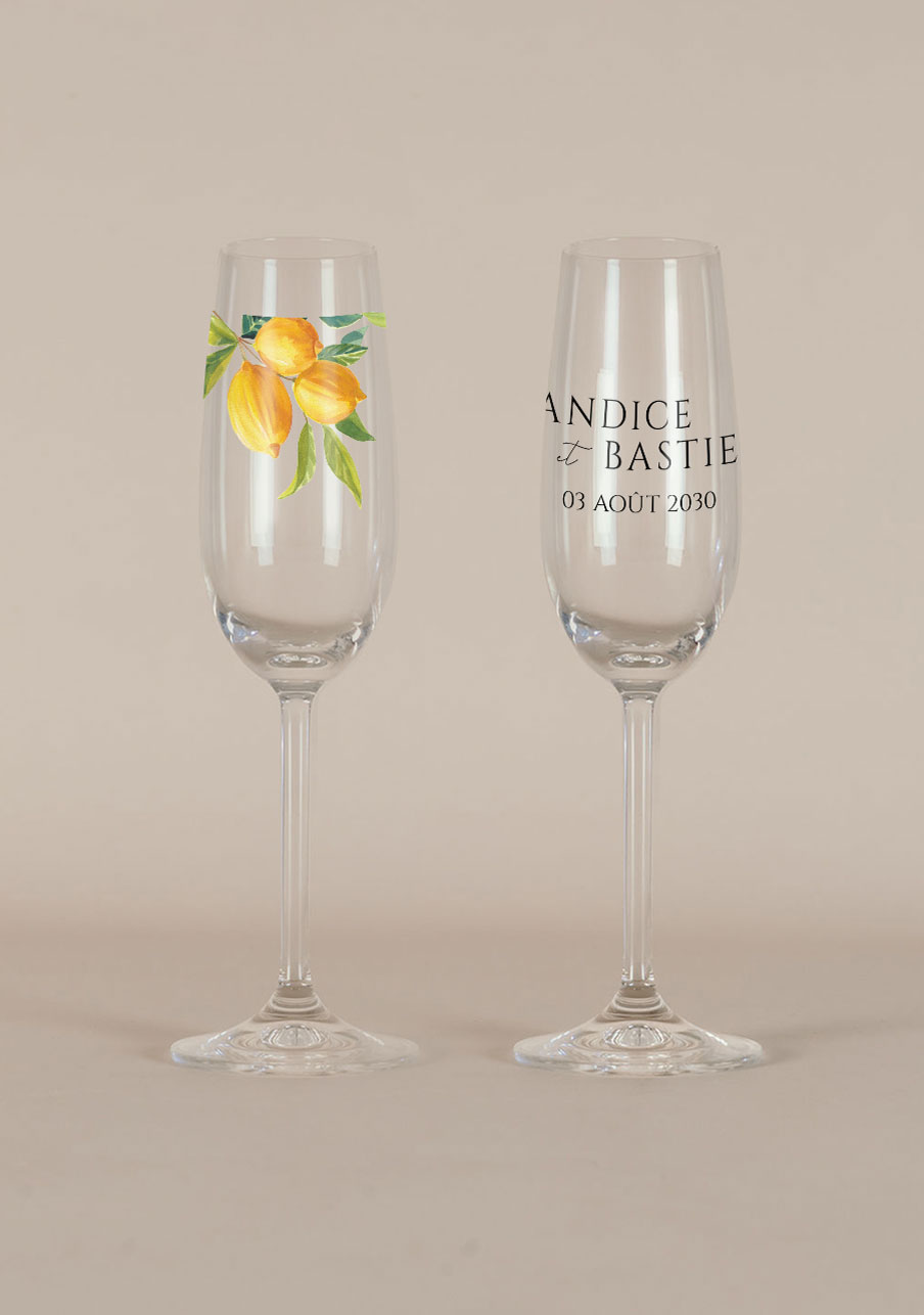 Ces flûtes ont une jolie forme et la gravure rend bien. Je les ai montrées au traiteur qui a paru surpris. ce n'est pas un modèle qu'il doit voir couramment. Je lui ai donné les coordonnées du site. Vraiment parfait pour donner à mes invités.