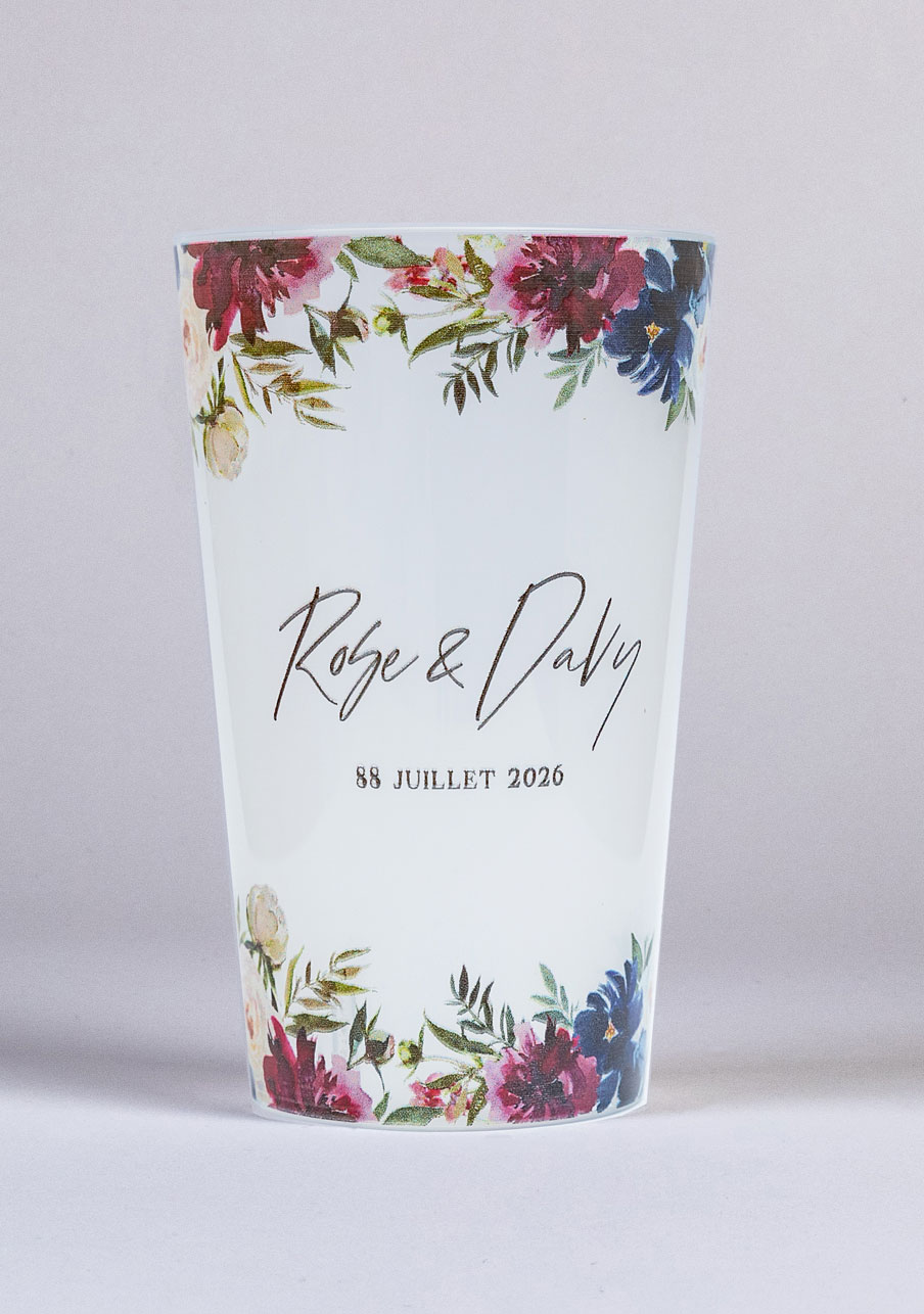 Si la nature est le fil conducteur de votre décoration, impossible de passer à côté de ce thème de gobelet de mariage à personnaliser. D’une part parce que ses motifs sont parfaitement dans le thème et d’autre part parce qu’il s’agit de l’un des cadeaux de mariage les plus écolos qui soient. Et oui ! Nos écocups de mariage sont durables, incassables et réutilisables à l’infini… Difficile de leur trouver des inconvénients. Vous pouvez les utiliser au cours de la soirée (pas besoin de louer de la vaisselle supplémentaire et de prendre le risque de la casser) et offrir à vos proches le petit verre qui les suivra ensuite partout (fête, anniversaire, pique-nique, etc.). Croyez-nous, ils n’hésiteront pas longtemps avant de se laisser convaincre. Nous vous conseillons d’ailleurs d’en commander quelques exemplaires pour vous, en souvenir, et de bien les cacher. Dans le cas contraire, ils pourraient être emportés par des proches un peu trop gourmands.