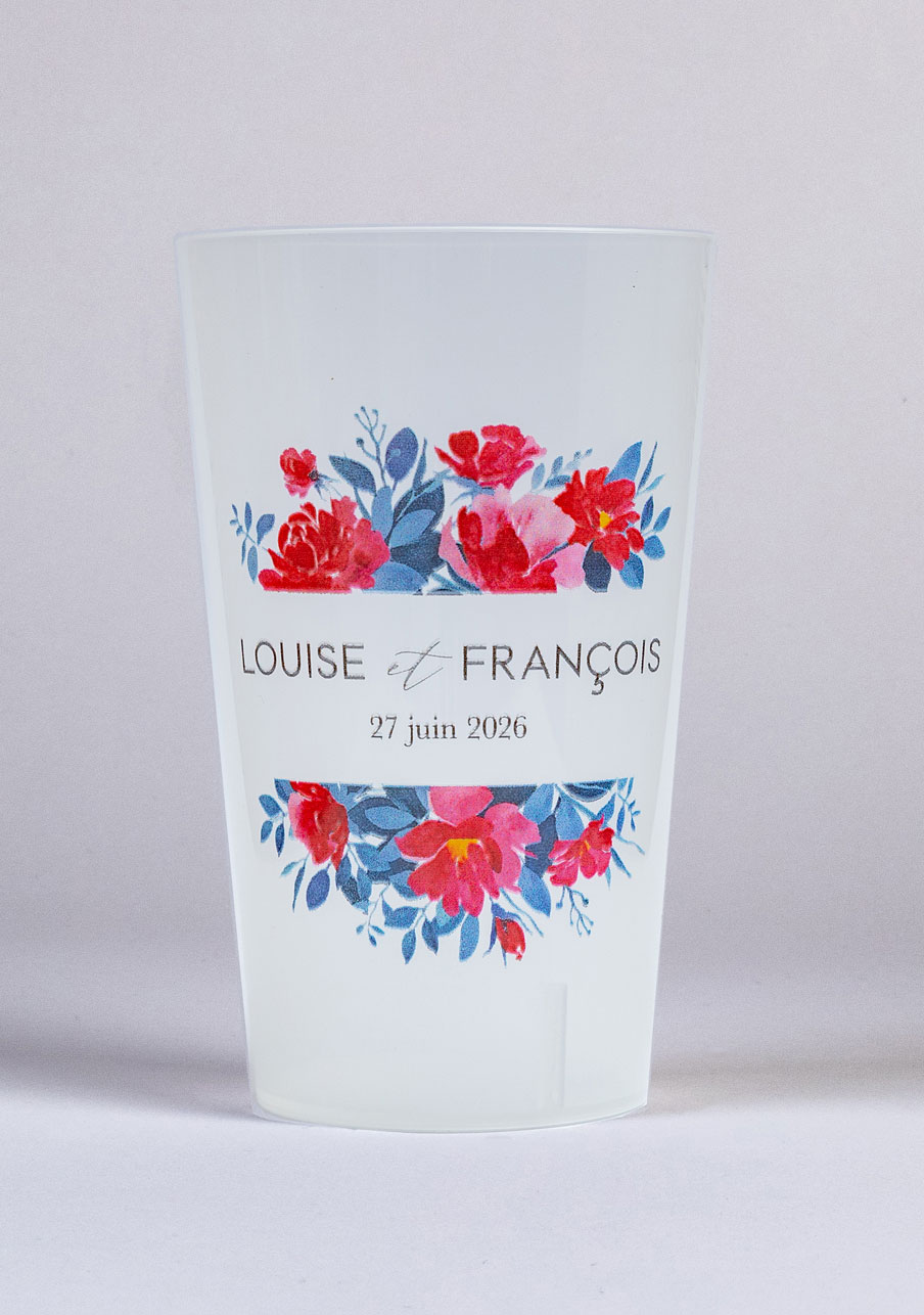 Envie de créer la surprise avec un cadeau de mariage pour invités pas comme les autres ? Pensez au gobelet de mariage personnalisé. Sa mission ? Ajouter de la modernité à votre journée de mariage. Bye bye les dragées et bienvenue à ce petit cadeau d’invités qui casse les codes et se montre très pratique. On aime l’idée de pouvoir l’utiliser sur place et longtemps après. Incassable, réutilisable à l’infini et durable, il répond justement avec brio à ces attentes. Une bonne nouvelle qui devrait également réjouir vos proches. Pour personnaliser ce modèle fleuri et coloré, il vous suffit de confier vos informations aux graphistes de l’équipe de Petit Mariage entre Amis. Ils se chargent alors de travailler dur pour concevoir le visuel qui vous ressemble. Il ne vous reste plus qu’à le valider pour que nous puissions lancer l’impression. Vos écocups de mariage vous rejoignent ensuite sous quelques jours seulement.