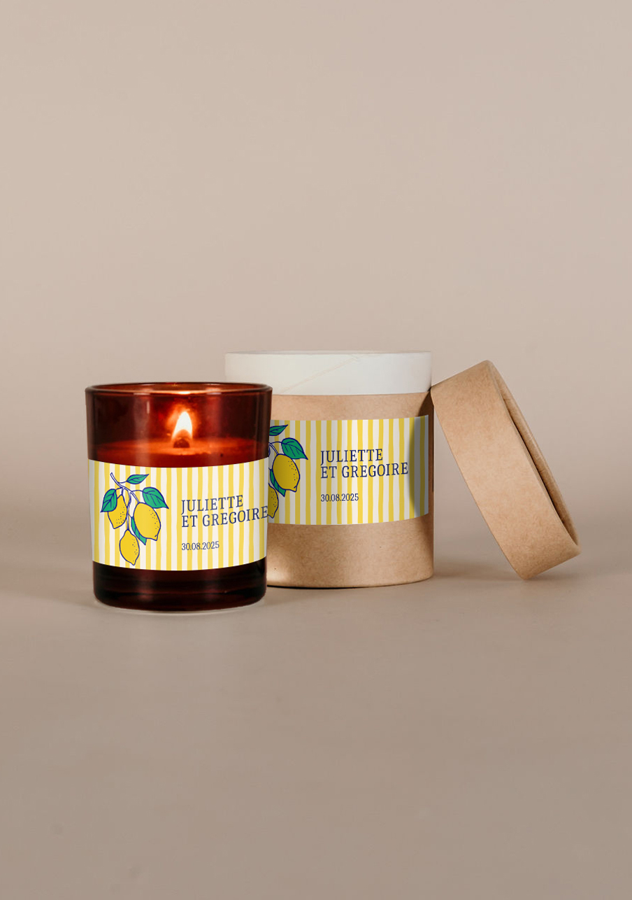 - Optez pour un cadeau élégant avec ces petites bougies en verre ambrées présentées dans leur jolie boîte en kraft et personnalisées avec leurs étiquettes.