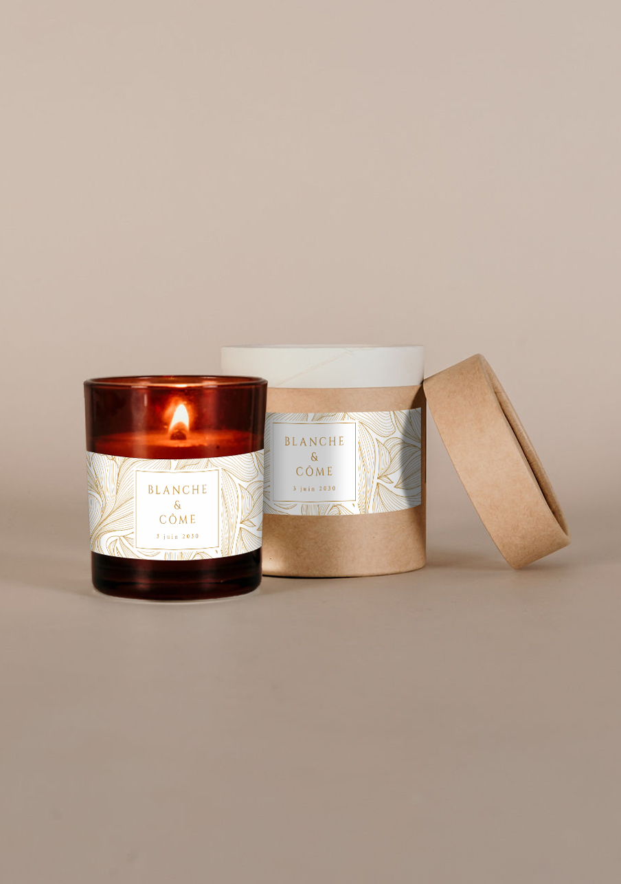 • Optez pour un cadeau élégant avec ces petites bougies en verre ambrées présentées dans leur jolie boîte en kraft et personnalisées avec leurs étiquettes.
