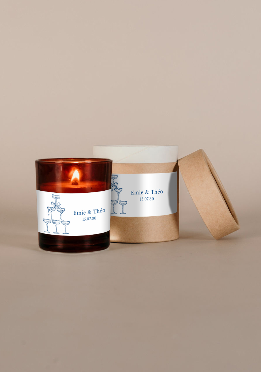- Optez pour un cadeau élégant avec ces petites bougies en verre ambrées présentées dans leur jolie boîte en kraft et personnalisées avec leurs étiquettes.