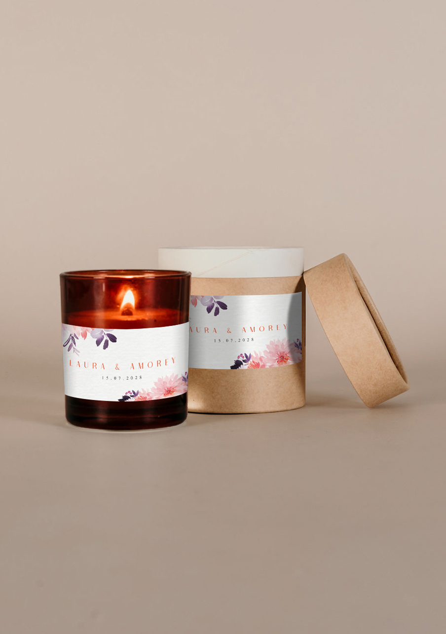 - Optez pour un cadeau élégant avec ces petites bougies en verre ambrées présentées dans leur jolie boîte en kraft et personnalisées avec leurs étiquettes.