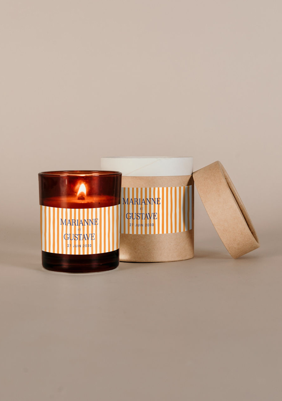 - Optez pour un cadeau élégant avec ces petites bougies en verre ambrées présentées dans leur jolie boîte en kraft et personnalisées avec leurs étiquettes.