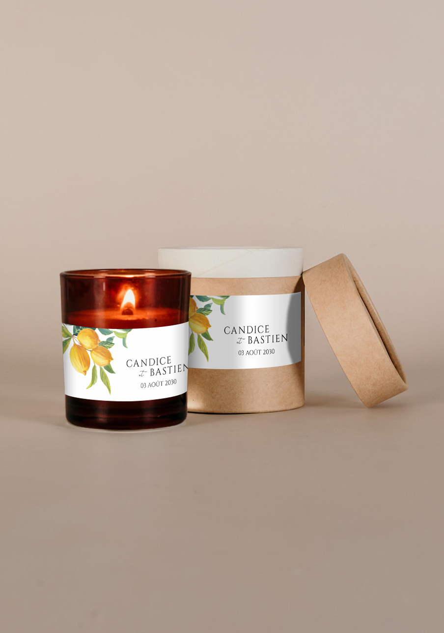 - Optez pour un cadeau élégant avec ces petites bougies en verre ambrées présentées dans leur jolie boîte en kraft et personnalisées avec leurs étiquettes.