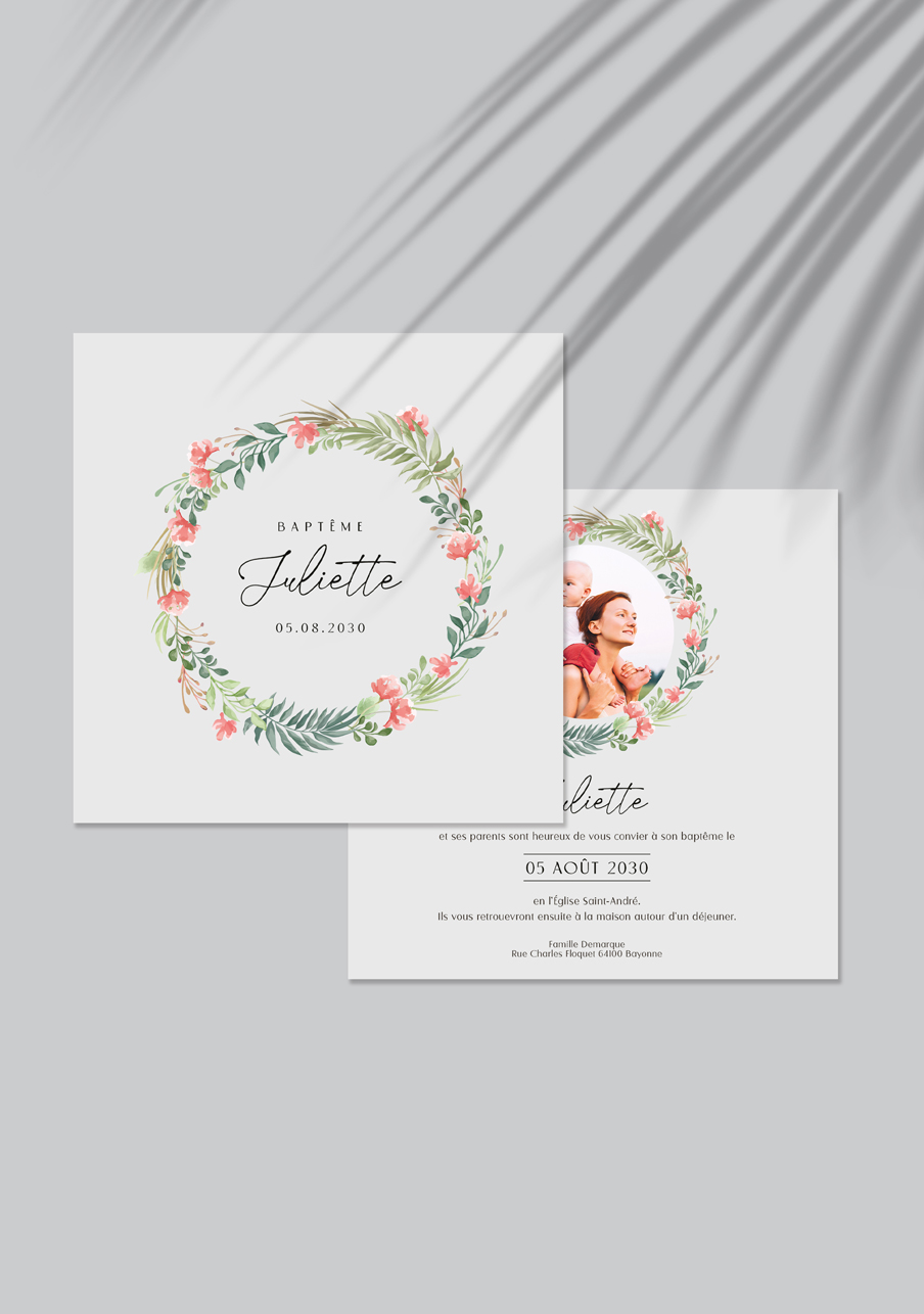 - Carton réponse (en option) : 14.8 x 10.5 cm en papier Olin mat 300gr blanc naturel (lisse) ou Rives Tradition 320gr