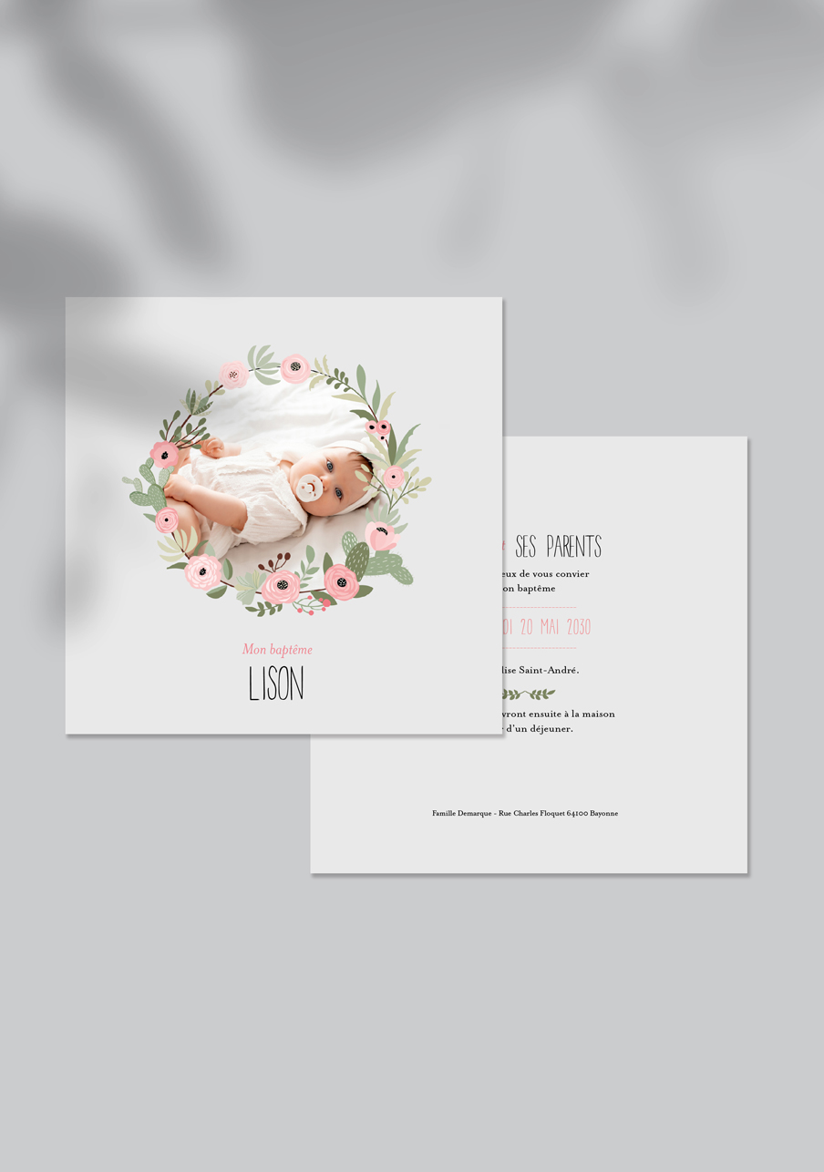 - Carton réponse (en option) : 14.8 x 10.5 cm en papier Olin mat 300gr blanc naturel (lisse) ou Rives Tradition 320gr
