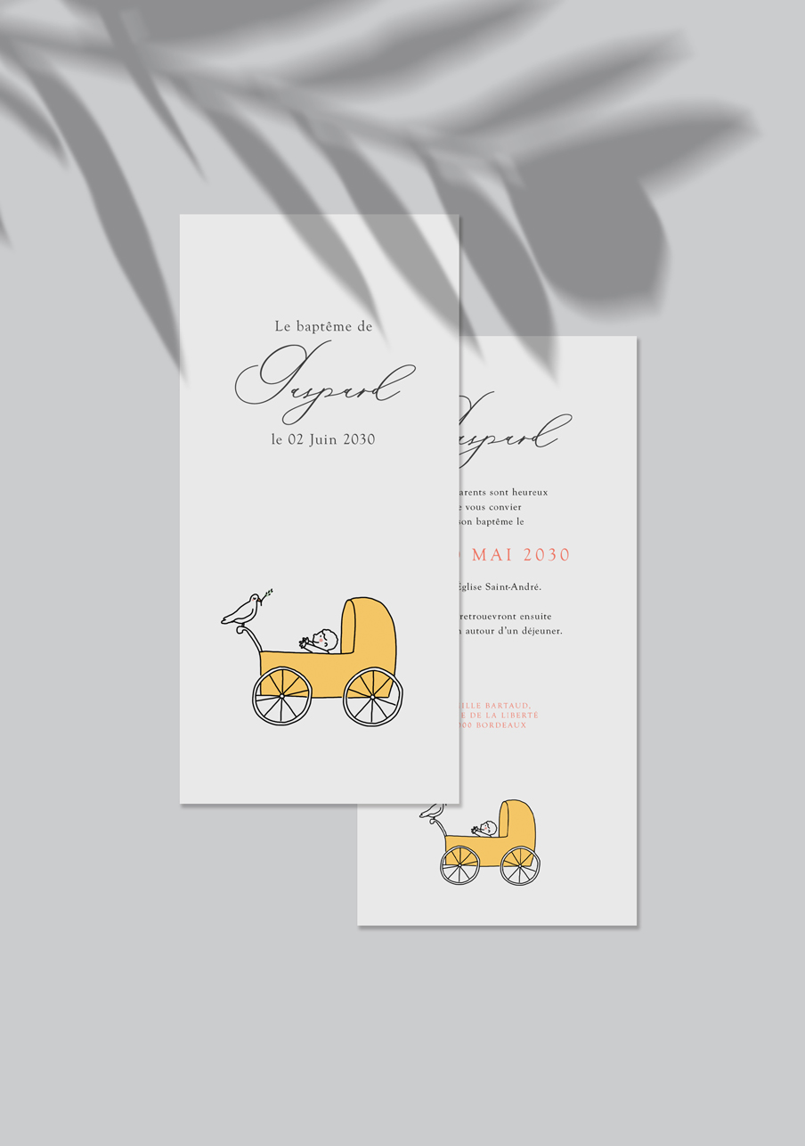 - Carton réponse (en option) : 14.8 x 10.5 cm en papier Olin mat 300gr blanc naturel (lisse) ou Rives Tradition 320gr