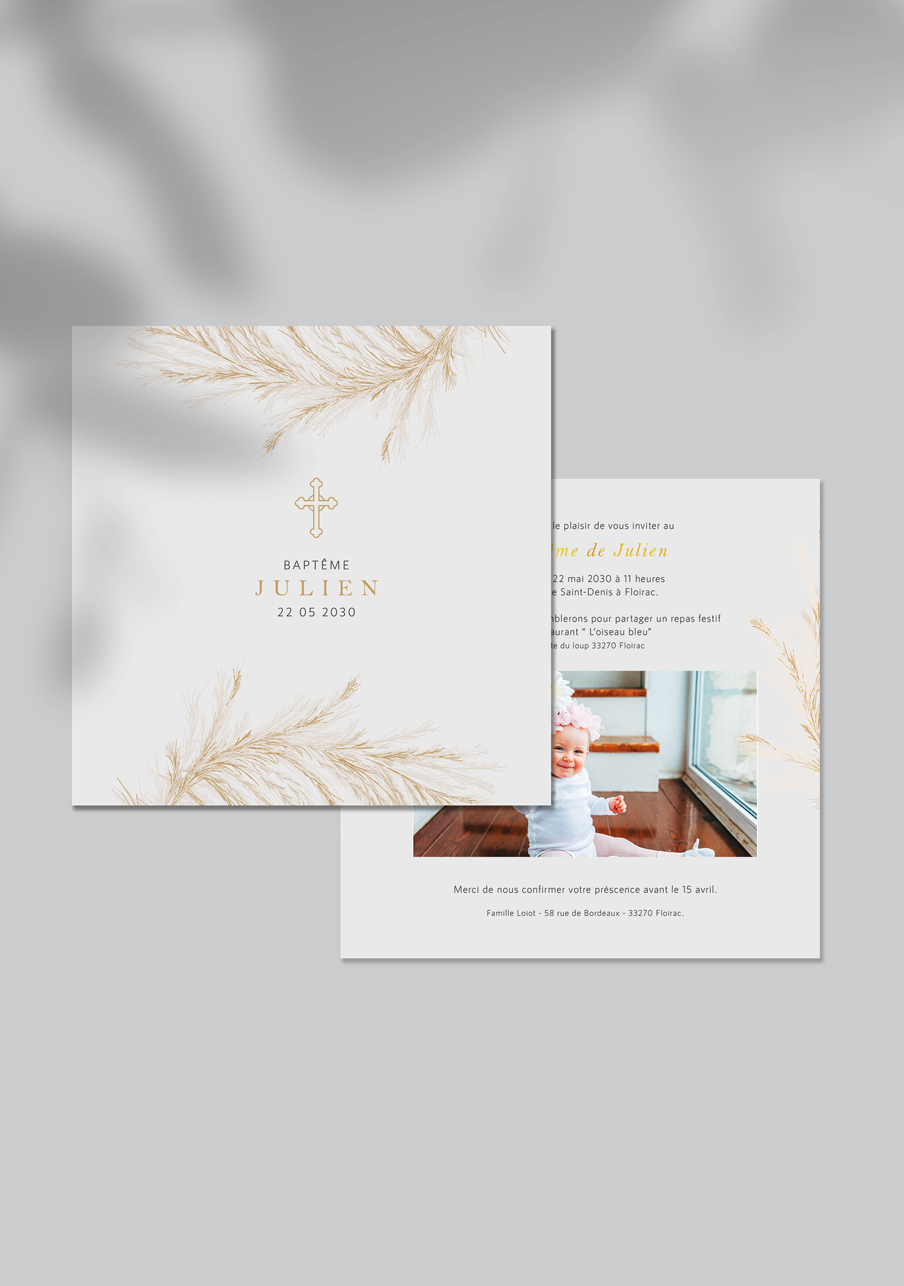 - Carton réponse (en option) : 14.8 x 10.5 cm en papier Olin mat 300gr blanc naturel (lisse) ou Rives Tradition 320gr