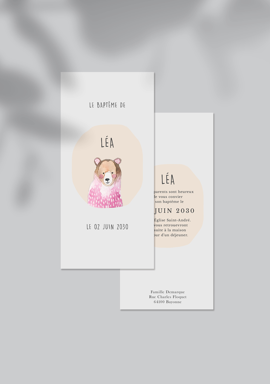 - Carton réponse (en option) : 14.8 x 10.5 cm en papier Olin mat 300gr blanc naturel (lisse) ou Rives Tradition 320gr