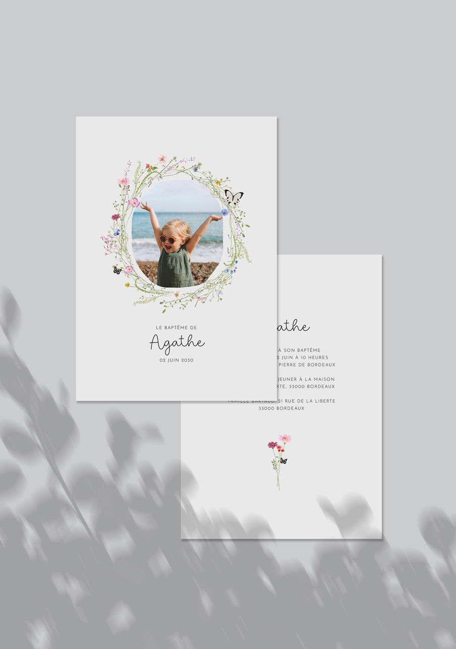 - Carton réponse (en option) : 14.8 x 10.5 cm en papier Olin mat 300gr blanc naturel (lisse) ou Rives Tradition 320gr