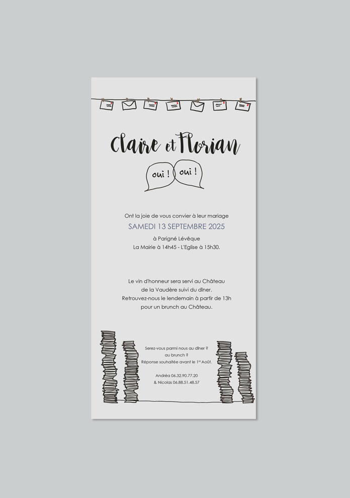 - Carton réponse (en option) : 14.8 x 10.5 cm en papier Olin mat 300gr blanc naturel (lisse) ou Rives Tradition 320gr