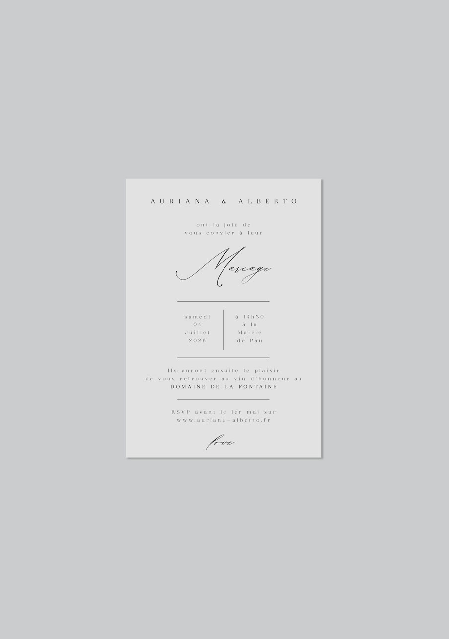 - Carton réponse (en option) : 14.8 x 10.5 cm en papier Olin mat 300gr blanc naturel (lisse) ou Rives Tradition 320gr